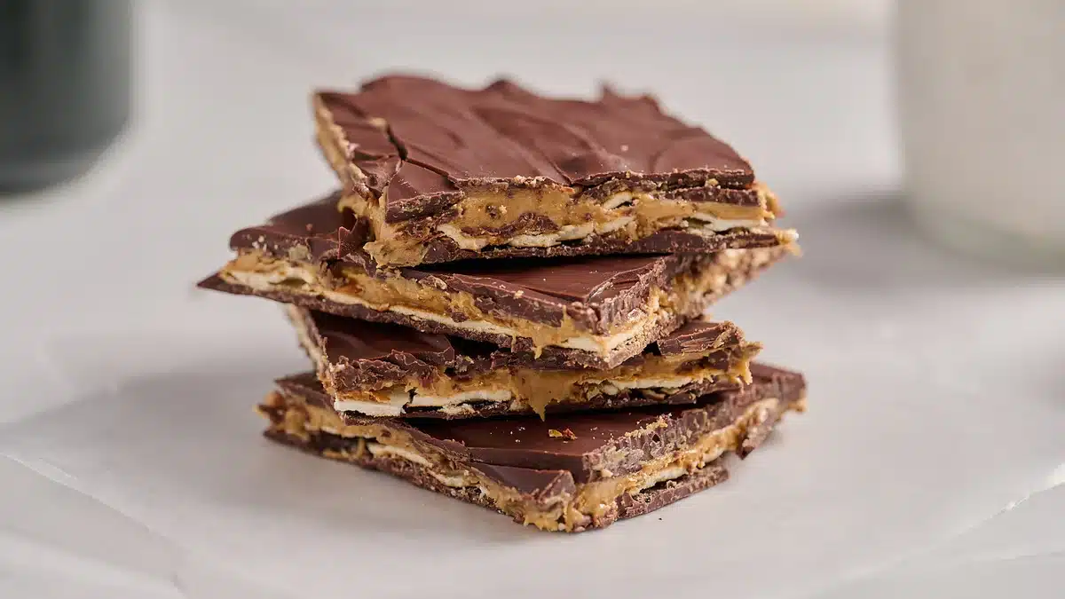 32 pretzel crisps (bretzels plats et fins, à distinguer des bretzels torsadés classiques) forment la couche intermédiaire. Leur surface plane permet de les disposer en une seule couche régulière, ce qui garantit une découpe propre des morceaux. Et 1 tasse de beurre de cacahuète vient napper cette couche de bretzels avant d'être recouverte de chocolat.